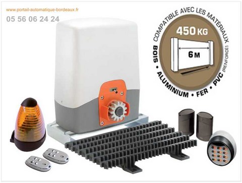 Portail coulissant avec un moteur puissante vous permettant de motoriser tout type de portail de 5 mètres de large et de 500 kg maximum. Ce moteur électrique pour portail coulissant à la fois résistant, robuste et au design sobre est fourni avec 5 mètres de crémaillères pour faire coulisser votre portail latéralement de la gauche vers la dtoite. auto apprentissage et réglage automatique de l’effort.