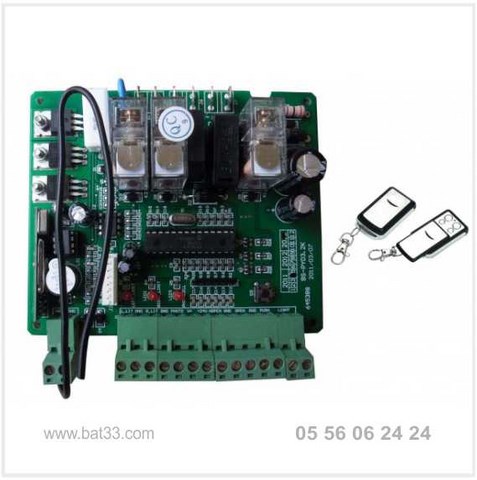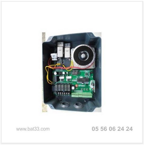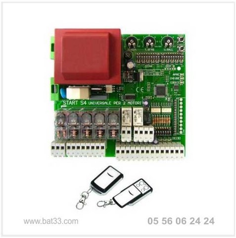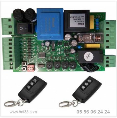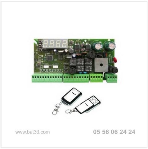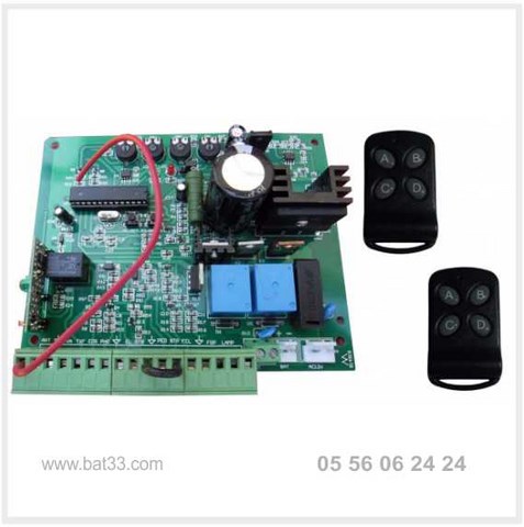 Carte de petite taille permettant de se loger dans de nombreux emplacement avec plusieurs niveaux de programmation permettant de répondre aux différents type d'installation et avec les particularités de chacune. Elle remplace n'importe qu'elle autre marque de carte électronique pour moteur 220 volts. 2 Moteurs 220 volts, lampes clignotante, Cellules, sorties alimentations accessoires 24VAC. Sortie disponible pour branchement de commande externe: commande ouverture totale et passage piéton. Télécommande supplémentaire pour 14,9 euros.